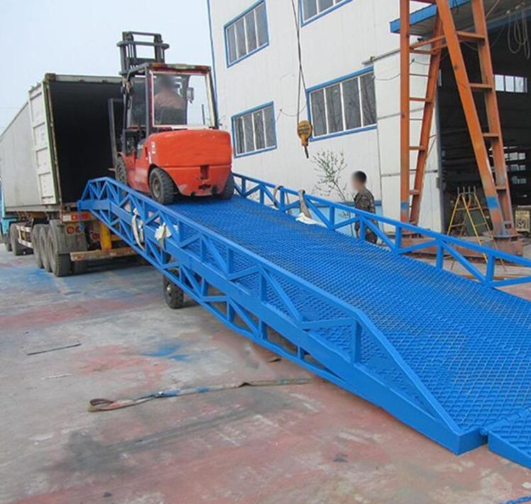 威海登車橋-威海移動登車橋-集裝箱裝卸貨平臺-液壓裝車橋。移動登車橋采用人工液壓動力,不需外接動力電源,只需單人操作,就可以實現(xiàn)貨物的安全快速裝卸,節(jié)省時間和人力資源。它可使企業(yè)減少大量勞動力,成倍提高裝卸作業(yè)效率,加快貨物流通速度,獲取更大經(jīng)濟效益。移動登車橋被廣泛應用于無裝卸設備的貨臺及流動裝卸場所,是與叉車配合使用的貨物裝卸輔助設備。并可以根據(jù)不同的車型及裝車過程車廂的高度變化進行調(diào)節(jié)。廣泛應用于工廠運輸備料、物流集散中心運輸貨物、港口碼頭上下集裝箱,隨著工礦企業(yè)的發(fā)展移動式液壓登車橋越來越被廣泛的應用到各行各業(yè)卸貨中。